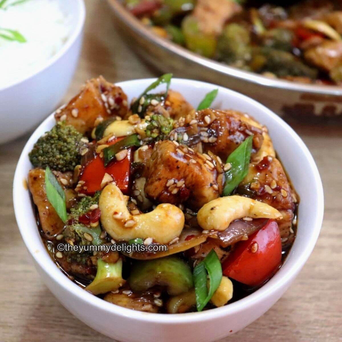 close-up of chicken and vegetable stir fry served in a white bowl.