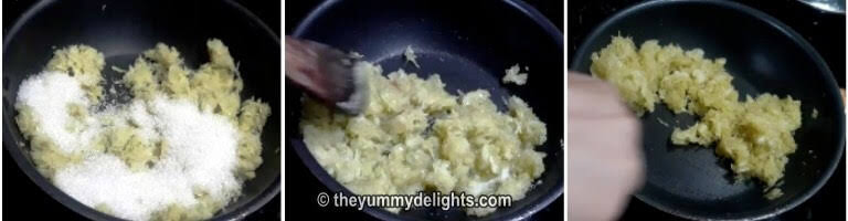 - Add sugar and mix it well. Once the sugar dissolves the mixture will become thin & liquidy. Again keep stirring it until the moisture from the mixture evaporates.