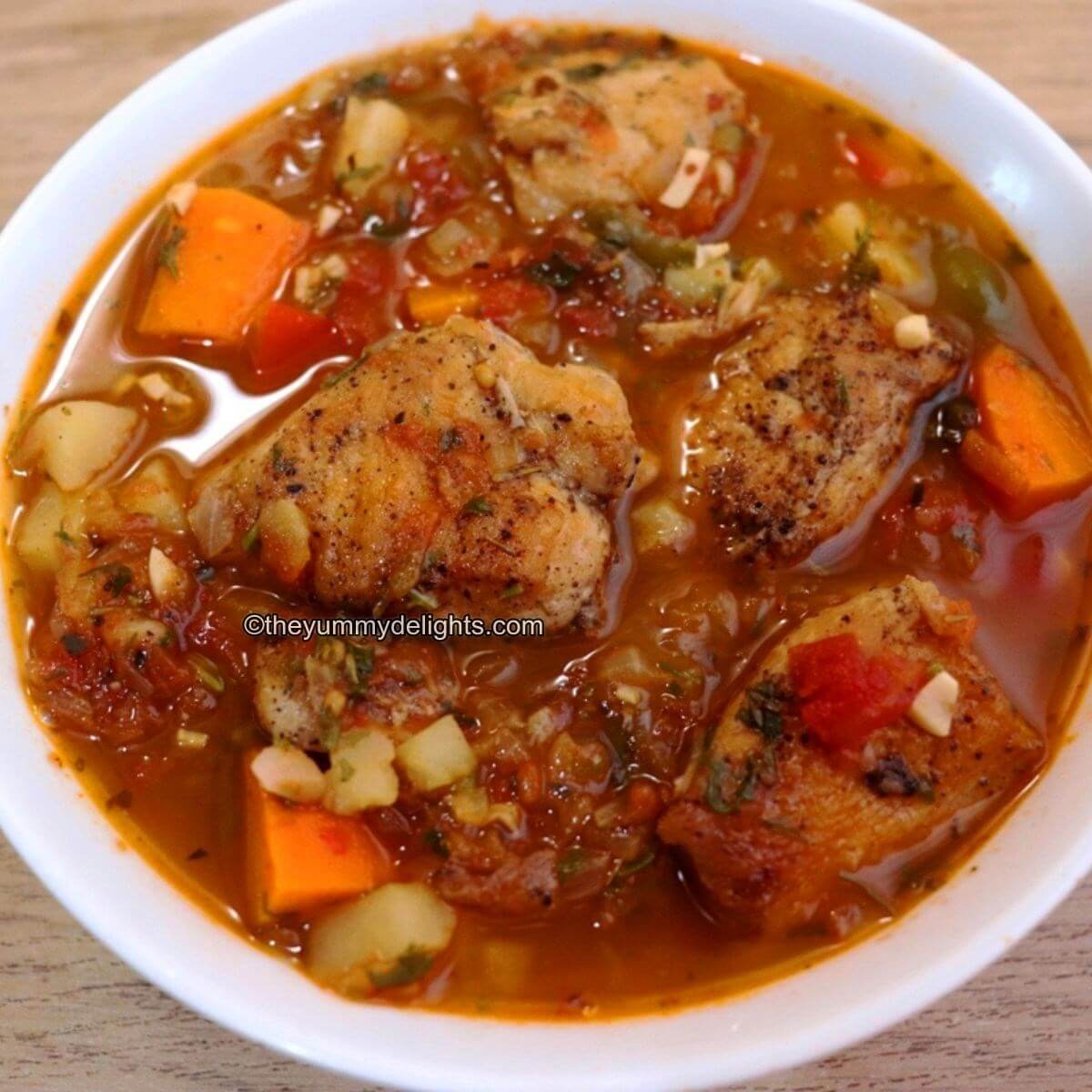 close-up of mediterranean chicken stew served in a white colored bowl.